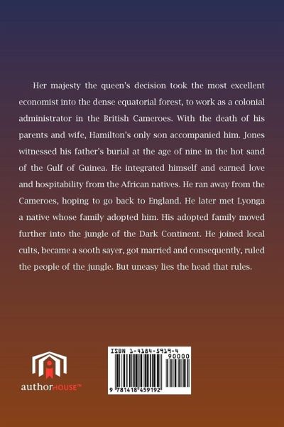Her majesty the queen's decision took the most excellent economist into the dense equatorial forest, to work as a colonial administrator in the British Cameroes. With the death of his parents and wife, Hamilton's only son accompanied him. Jones witnessed his father's burial at the age of nine in the hot sand of the Gulf of Guinea. He integrated himself and earned love and hospitability from the African natives. He ran away from the Cameroes, hoping to go back to England. He later met Lyonga a native whose family adopted him. His adopted family moved further into the jungle of the Dark Continent. He joined local cults, became a sooth sayer, got married and consequently, ruled the people of the jungle. But uneasy lies the head that rules.
