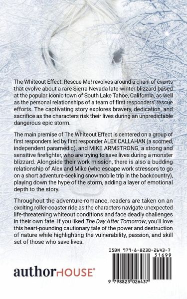 The Whiteout Effect: Rescue Me! revolves around a chain of events that evolve about a rare Sierra Nevada late-winter blizzard based at the popular iconic town of South Lake Tahoe, California, as well as the personal relationships of a team of first responders' rescue efforts. The captivating story explores bravery, dedication, and sacrifice as the characters risk their lives during an unpredictable dangerous epic storm. The main premise of The Whiteout Effect is centered on a group of first responders led by first responder ALEX CALLAHAN (a scorned, independent paramedic), and MIKE ARMSTRONG, a strong and sensitive firefighter, who are trying to save lives during a monster blizzard. Alongside their work mission, there is also a budding relationship of Alex and Mike (who escape work stressors to go on a short adventure-seeking snowmobile trip in the backcountry), playing down the hype of the storm, adding a layer of emotional depth to the story. Throughout the adventure-romance, readers are taken on an exciting roller-coaster ride as the characters navigate unexpected life-threatening whiteout conditions and face deadly challenges in their own fate. If you liked The Day After Tomorrow, you'll love this heart-pounding cautionary tale of the power and destruction of nature while highlighting the vulnerability, passion, and skill set of those who save lives.