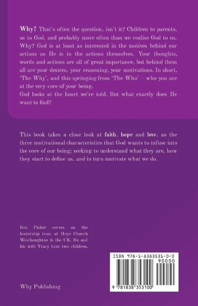 Why? That's often the question, isn't it? Children to parents, us to God, and probably more often than we realise God to us. Why? God is at least as interested in the motives behind our actions as He is in the actions themselves. Your thoughts, words and actions are all of great importance, but behind them all are your desires, your reasoning, your motivations. In short, 'The Why', and this springing from 'The Who' - who you are at the very core of your being. God looks at the heart we're told. But what exactly does He want to find? This book takes a close look at faith, hope and love, as the three motivational characteristics that God wants to infuse into the core of our being; seeking to understand what they are, how they start to define us, and in turn motivate what we do.