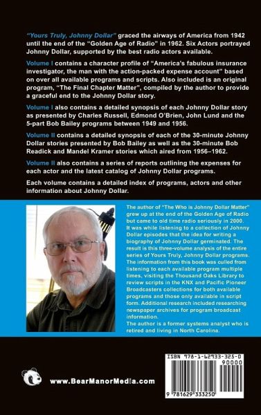 "Yours Truly, Johnny Dollar" graced the airways of America from 1942 until the end of the "Golden Age of Radio" in 1962. Six Actors portrayed Johnny Dollar, supported by the best radio actors available. Volume I contains a character profile of "America’s fabulous insurance investigator, the man with the action-packed expense account" based on over all available programs and scripts. Also included is an original program, "The Final Chapter Matter", compiled by the author to provide a graceful end to the Johnny Dollar story. Volume I also contains a detailed synopsis of each Johnny Dollar story as presented by Charles Russell, Edmond O’Brien, John Lund and the 5-part Bob Bailey programs between 1949 and 1956.