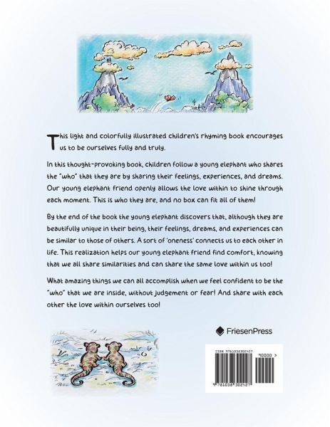This light and colorfully illustrated children's rhyming book encourages us to be ourselves fully and truly. In this thought-provoking book, children follow a young elephant who shares the "who" that they are by sharing their feelings, experiences, and dreams. Our young elephant friend openly allows the love within to shine through each moment. This is who they are, and no box can fit all of them! By the end of the book the young elephant discovers that, although they are beautifully unique in their being, their feelings, dreams, and experiences can be similar to those of others. A sort of 'oneness' connects us to each other in life. This realization helps our young elephant friend find comfort, knowing that we all share similarities and can share the same love within us too! What amazing things we can all accomplish when we feel confident to be the "who" that we are inside, without judgement or fear! And share with each other the love within ourselves too!
