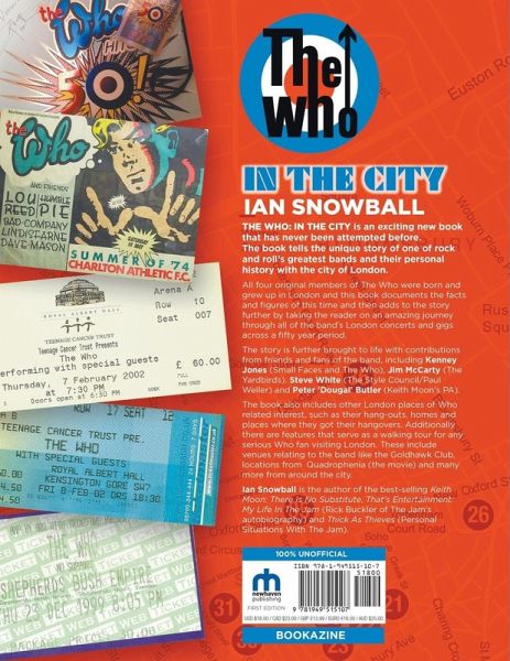 The Who: In The City is an exciting new book that has never been attempted before. The book tells the unique story of one of rock and rolls greatest bands and their personal history with the city of London. All four original members of The Who were born and grew up in London and this book documents the facts and figures of this time and then adds to the story further by taking the reader on an amazing journey through all of the bands London concerts and gigs across a fifty year period. The story is further brought to life with contributions from friends and fans of the band and these include Kenney Jones (Small Faces and The Who), Jim McCarty (The Yardbirds), Steve White (The Style Council/Paul Weller) and Peter 'Dougal' Butler (Keith Moon's PA). The book also includes other London places of Who related interest, such as their hang-out's, homes and where they got their hangovers. Additionally there are features, that serve as a walking tour for any serious Who fan visiting London and these include locations relating to the band like the Goldhawk Club and Quadrophenia (the movie) and many more from around city.Ian Snowball is the author the best-selling Keith Moon: There Is No Substitute, That's Entertainment: My Life In The Jam (Rick Buckler of The Jam's autobiography) and Thick As Thieves (Personal Situations With The Jam).