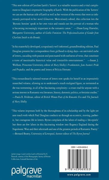 'This new edition of Caroline Lamb's 'Letters' is a valuable resource and a vital complement to Douglass's impressive biography of Lamb. With the publication of the 'Letters' we can see the human side of Lamb as well as her version of the events that were so infamously portrayed in her novel Glenarvon. Meticulously edited, this collection lets the 'Byronic heroine' speak in her own voice and rounds out the portrait of a woman who is becoming increasingly important in the romantic canon.' Diane Long Hoeveler, Marquette University, author of Gothic Feminism: The Professionalization of Gender from Charlotte Smith to the Brontës.
