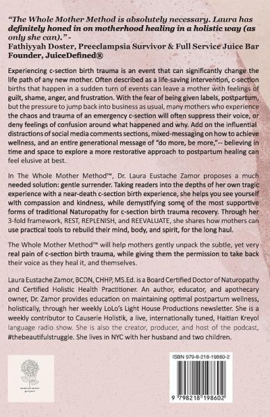 Experiencing c-section birth trauma is an event that can significantly change the life path of any new mother. Often described as a life-saving intervention, c-section births that happen in a sudden turn of events can leave a mother with feelings of guilt, shame, anger, and frustration. With the fear of being given labels, postpartum, but the pressure to jump back on the train of performance, many mothers who experience the chaos and trauma of an emergency c-section will often suppress, or deny feelings of confusion around what happened and why. Add on the influential distractions of social media, mixed-messaging on how to achieve wellness, and an entire generational message of "do more, be more,"-- believing time and space are needed to explore a more restorative approach to postpartum healing can feel elusive at best.In The Whole Mother Method(TM), Dr. Laura Eustache Zamor proposes a much needed solution to the fear of stagnation: surrender. Taking readers into the depths of her own tragic experience with a near-death c-section birth experience, she helps you see yourself with compassion and kindness, while demystifying some of the most supportive Naturopathic forms of care for recovery. Through her 3-fold framework, REST, REPLENISH, and REEVALUATE, she shares how mothers can use practical tools to rebuild their mind, body, and spirit, for the long haul.The Whole Mother Method(TM) will help mothers gently unpack the subtle, yet very real pain of c-section birth trauma, while giving them the permission to take back their voice as they heal it, and themselves.