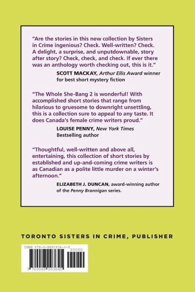 This is the second collection of mystery stories by Canadian members of Sisters in Crime. The collection features 24 stories by 21 Canadian members. The authors, including both established authors and those who are previously unpublished, are: Lou Allin, Catherine Astolfo, Linda Cahill, Melodie Campbell, Miriam Clavir, Susan Daly, Jill Downie, Elizabeth Hosang, P.M. Jones, Ann R. Loverock, H. MacDonald-Archer, Lesley Mang, Elaine Ruth Mitchell, Charlotte Morganti, Helen Nelson, Carol Newhouse, Judy Penz Sheluk, Steve Shrott, Madona Skaff, Coleen Steele and Linda Wiken. It is edited by Janet Costello. The stories have a variety of characters: shop owners, children, a thief, vengeful women, unhappy wives, a poet, police officers of both sexes and more... The stories are set mostly in Canada, in a wide variety of locations, including British Columbia, Northern Ontario, Alberta and Quebec! All stories were selected by a blind judging procedure.