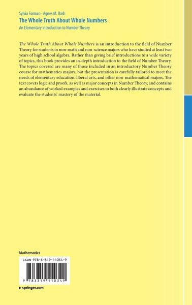 The Whole Truth About Whole Numbers is an introduction to the field of Number Theory for students in non-math and non-science majors who have studied at least two years of high school algebra. Rather than giving brief introductions to a wide variety of topics, this book provides an in-depth introduction to the field of Number Theory. The topics covered are many of those included in an introductory Number Theory course for mathematics majors, but the presentation is carefully tailored to meet the needs of elementary education, liberal arts, and other non-mathematical majors. The text covers logic and proofs, as well as major concepts in Number Theory, and contains an abundance of worked examples and exercises to both clearly illustrate concepts and evaluate the students' mastery of the material.