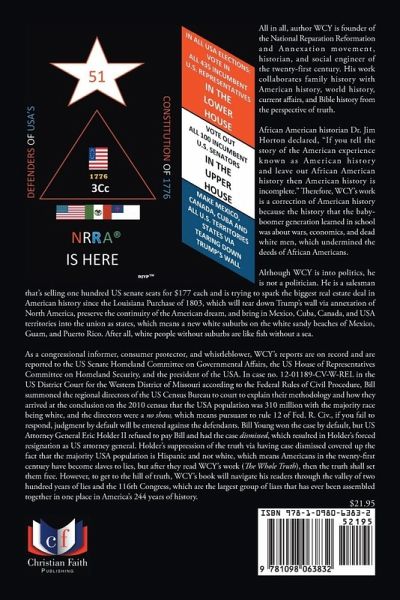 All in all, Author WCY is founder of the National Reparation Reformation & Annexation movement, historian, and Social Engineer of the 21st Century. His work collaborate family history with American history, world history, current affairs, and bible history from the perspective of truth. African American Historian Dr. Jim Horton declared: if you tell the story of the American experience known as American history and leave out African American history then American history is incomplete. Therefore, WCYs work is a correction of American history b/c the history that the baby boomer generation learned in school was about wars, economics, and dead white men which undermined the deeds of African Americans. Although WCY is into politics, he is not a politician. He is a salesman thats selling 100 U.S. senate seats for $177.00 each and is trying to spark the biggest real estate deal in American history since the Louisiana Purchase of 1803 that will tear down Trumps wall via annexation of North America, preserve the continuity of the American Dream and bring in Mexico, Cuba, Canada & USA territories into the union as states which means a new white suburbs on the white sandy beaches of Mexico, Guam, and Puerto Rico. After all, white people without suburbs are like fish without a sea. As a congressional informer, consumer protector, and whistle blower, WCYs reports are on record and are reported to the U.S. Senate Homeland Committee on Governmental Affairs, the U.S. House of Representatives Committee on Homeland Security and the president of the USA. In Case No. 12-01189-CV-W-REL in U.S. District Court for the Western District of Missouri according to the Federal Rules of Civil Procedure, Bill summoned the regional directors of the U.S. Census Bureau to court to explain their methodology and how they arrived at the conclusion on the 2010 Census that the USA population was 310 million with the majority race being white, and the directors were a NO SHOW which means pursuant to Rule 12 of Fed. R. Civ. If you fail to respond, judgment by default will be entered against the defendants. Bill Young won the case by default, but U.S. Attorney General Eric Holder, II refused to pay Bill and had the case DISMISSED which resulted in Holders forced resignation as U.S. Attorney General. Holders suppression of the truth via having case dismissed covered up the fact that the majority USA population is Hispanic and not white which means Americans in the 21st Century have become slaves to lies, but after they read WCYs work (THE WHOLE TRUTH) then the truth shall set them free. However, to get to the hill of truth, WCYs book will navigate his readers through the valley of 200 years of lies and the 116th Congress whom are the largest group of liars that has ever been assembled together in one place in Americas 244 years of American history.