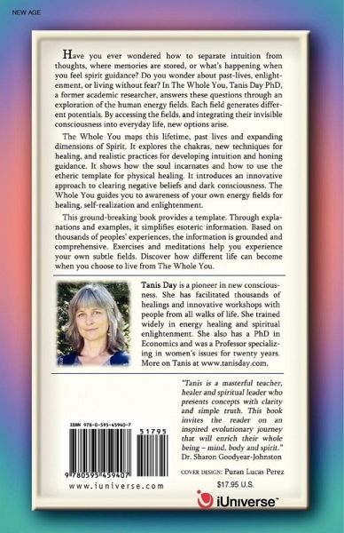Have you ever wondered how to separate intuition from thoughts, where memories are stored, or what's happening when you feel spirit guidance? Do you wonder about past-lives, enlightenment, or living without fear? In The Whole You, Tanis Day PhD, a former academic researcher, answers these questions through an exploration of the human energy fields. Each field generates different potentials. By accessing the fields, and integrating their invisible consciousness into everyday life, new options arise. The Whole You maps this lifetime, past lives and expanding dimensions of Spirit. It explores the chakras, new techniques for healing, and realistic practices for developing intuition and honing guidance. It shows how the soul incarnates and how to use the etheric template for physical healing. It introduces an innovative approach to clearing negative beliefs and dark consciousness. The Whole You guides you to awareness of your own energy fields for healing, self-realization and enlightenment. This ground-breaking book provides a template. Through explanations and examples, it simplifies esoteric information. Based on thousands of peoples' experiences, the information is grounded and comprehensive. Exercises and meditations help you experience your own subtle fields. Discover how different life can become when you choose to live from The Whole You.