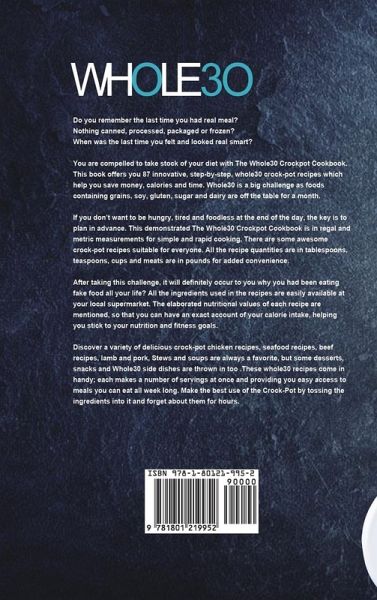 Do you remember the last time you had real meal? Nothing canned, processed, packaged or frozen? When was the last time you felt and looked real smart? You are compelled to take stock of your diet with The Whole30 Crockpot Cookbook. This book offers you 87 innovative, step-by-step, whole30 crock-pot recipes which help you save money, calories and time. Whole30 is a big challenge as foods containing grains, soy, gluten, sugar and dairy are off the table for a month. If you don't want to be hungry, tired and foodless at the end of the day, the key is to plan in advance. This demonstrated The Whole30 Crockpot Cookbook is in regal and metric measurements for simple and rapid cooking. There are some awesome crock-pot recipes suitable for everyone. All the recipe quantities are in tablespoons, teaspoons, cups and meats are in pounds for added convenience. After taking this challenge, it will definitely occur to you why you had been eating fake food all your life? All the ingredients used in the recipes are easily available at your local supermarket. The elaborated nutritional values of each recipe are mentioned, so that you can have an exact account of your calorie intake, helping you stick to your nutrition and fitness goals. Discover a variety of delicious crock-pot chicken recipes, seafood recipes, beef recipes, lamb and pork, Stews and soups are always a favorite, but some desserts, snacks and Whole30 side dishes are thrown in too .These whole30 recipes come in handy; each makes a number of servings at once and providing you easy access to meals you can eat all week long. Make the best use of the Crock-Pot by tossing the ingredients into it and forget about them for hours.