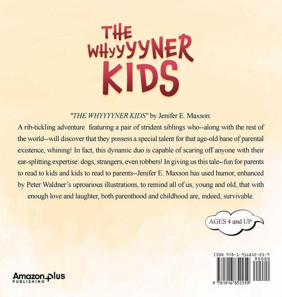 A rib-tickling adventure featuring a pair of strident siblings who--along with the rest of the world--will discover that they possess a special talent for that age-old bane of parental existence, whining! In fact, this dynamic duo is capable of scaring off anyone with their ear-splitting expertise: dogs, strangers, even robbers! In giving us this tale--fun for parents to read to kids and kids to read to parents--Jenifer E. Maxson has used humor, enhanced by Peter Waldner's uproarious illustrations, to remind all of us, young and old, that with enough love and laughter, both parenthood and childhood are, indeed, survivable.
