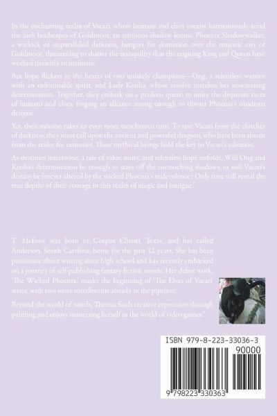 In the enchanting realm of Vacari, where humans and elves coexist harmoniously amid the lush landscapes of Goldmoor, an ominous shadow looms. Phoenix Shadowwalker, a warlock of unparalleled darkness, hungers for dominion over the majestic city of Goldmoor, threatening to shatter the tranquility that the reigning King and Queen have worked tirelessly to maintain. But hope flickers in the hearts of two unlikely champions-Ong, a relentless warrior with an indomitable spirit, and Lady Keisha, whose resolve matches her unwavering determination. Together, they embark on a perilous quest: to unite the disparate races of humans and elves, forging an alliance strong enough to thwart Phoenix's insidious designs. Yet, their mission takes an even more treacherous turn. To save Vacari from the clutches of darkness, they must call upon the ancient and powerful dragons, who have been absent from the realm for centuries. These mythical beings hold the key to Vacari's salvation. As destinies intertwine, a tale of valor, unity, and relentless hope unfolds. Will Ong and Keisha's determination be enough to stave off the encroaching shadows, or will Vacari's destiny be forever altered by the wicked Phoenix's malevolence? Only time will reveal the true depths of their courage in this realm of magic and intrigue." ¿ Reader Praise for T.A. McEvoy "Epic fantasy that sweeps you into another world." "Unforgettable characters and breathtaking lore." Read reviews or leave your own: www.tamcevoy.com/customer-reviews