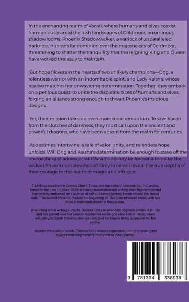 In the enchanting realm of Vacari, where humans and elves coexist harmoniously amid the lush landscapes of Goldmoor, an ominous shadow looms. Phoenix Shadowwalker, a warlock of unparalleled darkness, hungers for dominion over the majestic city of Goldmoor, threatening to shatter the tranquility that the reigning King and Queen have worked tirelessly to maintain. But hope flickers in the hearts of two unlikely champions-Ong, a relentless warrior with an indomitable spirit, and Lady Keisha, whose resolve matches her unwavering determination. Together, they embark on a perilous quest: to unite the disparate races of humans and elves, forging an alliance strong enough to thwart Phoenix's insidious designs. Yet, their mission takes an even more treacherous turn. To save Vacari from the clutches of darkness, they must call upon the ancient and powerful dragons, who have been absent from the realm for centuries. As destinies intertwine, a tale of valor, unity, and relentless hope unfolds. Will Ong and Keisha's determination be enough to stave off the encroaching shadows, or will Vacari's destiny be forever altered by the wicked Phoenix's malevolence? Only time will reveal the true depths of their courage in this realm of magic and intrigue." Reader Praise for T.A. McEvoy "Epic fantasy that sweeps you into another world." "Unforgettable characters and breathtaking lore." Read reviews or leave your own: www.tamcevoy.com/customer-reviews