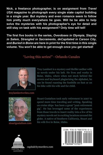 Nick, a freelance photographer, is on assignment from Travel USA magazine to photograph every single state capitol building in a single year. But mystery and even romance seem to follow him pretty much everywhere he goes. Will he be able to help solve the mysteries with his photographer's eye for detail and still stay on task with his assignment? Only time will tell! The first five books in the series, Overdoses in Olympia, Slaying in Salem, Strangled in Sacramento, deCapitated in Carson City, and Buried in Boise are here in print for the first time in this single volume. You won't be able to get enough once you get started!