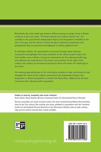 This report presents critical new evidence on the size of the widening health gap. New geographical data are presented and displayed in striking graphical form. The widening gap should be read alongside Inequalities in health: The evidence presented to the Independent Inquiry into Inequalities in Health (The Policy Press, 1999).