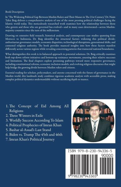 Book Description In "The Widening Political Gap Between Muslim Rulers and Their Masses in The 21st Century," Dr. Naim Tahir Baig delivers a comprehensive analysis of one of the most pressing political challenges facing the Islamic world today. This meticulously researched work examines how the relationship between those who govern and those who are governed has evolved-and in many cases deteriorated-across Muslim-majority countries since the turn of the millennium. Drawing on extensive field research, historical analysis, and contemporary case studies spanning from Morocco to Indonesia, Dr. Baig identifies the structural factors widening this political divide: authoritarian governance models, economic disparities, technological disruptions, generational shifts, and contested religious authority. The book provides nuanced insights into how these factors manifest differently across various regions while revealing concerning patterns that transcend national boundaries. What distinguishes this work is its balanced approach to potential solutions. Dr. Baig critically examines both top-down reform initiatives and bottom-up resistance movements, assessing their relative successes and limitations. The final chapters explore promising pathways toward more responsive governance, including constitutional reforms, economic inclusion models, and evolving religious discourses that might help bridge the growing divide between Muslim rulers and citizens. Essential reading for scholars, policymakers, and anyone concerned with the future of governance in the Muslim world, this landmark study combines rigorous academic analysis with accessible prose, making complex political dynamics understandable without sacrificing depth or nuance.