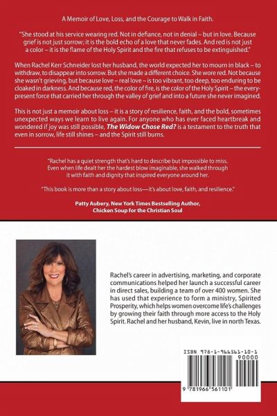 A Memoir of Love, Loss, and the Courage to Walk in Faith. "She stood at his service wearing red. Not in defiance, not in denial - but in love. Because grief is not just sorrow; it is the bold echo of a love that never fades. And red is not just a color - it is the flame of the Holy Spirit and the fire that refuses to be extinguished." When Rachel Kerr Schneider lost her husband, the world expected her to mourn in black - to withdraw, to disappear into sorrow. But she made a different choice. She wore red. Not because she wasn't grieving, but because love - real love - is too vibrant, too deep, too enduring to be cloaked in darkness. And because red, the color of fire, is the color of the Holy Spirit - the every-present force that carried her through the valley of grief and into a future she never imagined. This is not just a memoir about loss - it is a story of resilience, faith, and the bold, sometimes unexpected ways we learn to live again. For anyone who has ever faced heartbreak and wondered if joy was still possible, The Widow Chose Red? is a testament to the truth that even in sorrow, life still shines - and the Spirit still burns.