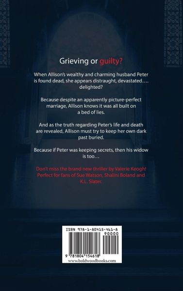 'Keogh is the queen of compelling narratives and twisty plots' Jenny O'BrienThe brilliant new psychological thriller from bestseller Valerie Keogh. 'A wonderful book, I can't rate this one highly enough. If only there were ten stars, it's that good. Valerie Keogh is a master story-teller, and this is a masterful performance.' Bestselling author Anita Waller. Grieving or guilty? When Allison's wealthy and charming husband Peter is found dead, she appears distraught, devastated....delighted? Because despite an apparently picture-perfect marriage, Allison knows it was all built on a bed of lies. And as the truth regarding Peter's life and death are revealed, Allison must try to keep her own dark past buried. Because if Peter was keeping secrets, then his widow is too... Don't miss the brand new thriller by Valerie Keogh! Perfect for fans of Sue Watson, Shalini Boland and K.L. Slater. What people are saying about Valerie Keogh... 'This is an amazing book, just buy it, and sit back and enjoy the ride. A massive five shiny starts from me.' Bestselling author Anita Waller