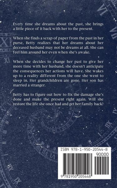 When she finds a scrap of paper from the past in her purse, Betty realizes that her dreams about her deceased husband may not be dreams at all. She can feel him around her even when she's awake. Every time she dreams about the past, she brings a little piece of it back with her to the present. When she decides to change her past to give her more time with her husband, she doesn't anticipate the consequences her actions will have. She wakes up to a reality different from the one she went to sleep in. Her grandchildren are gone. Her son has married a stranger. Betty has to figure out how to fix the damage she's done and make the present right again. Will she restore the life she once had and get her family back?