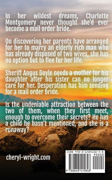 In her wildest dreams Charlotte Montgomery never thought she’d ever become a mail order bride. On discovering her parents have arranged for her to marry an elderly rich man who has already disposed of two wives, she has no option but to flee for her life. Sheriff Angus Doyle needs a mother for his daughter after his sister can no longer care for her. Desperation has him sending for a mail order bride. Is the undeniable attraction between the two of them, when they first meet, enough to overcome their secrets? He has a child he hasn’t mentioned, and she is a runaway?