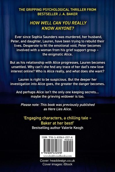 A gripping psychological thriller from top 50 bestselling author J. A. Baker! How well can you really know anyone? Ever since Sophia Saunders was murdered, her husband, Peter, and daughter, Lauren, have been trying to rebuild their lives. Desperate to fill the emotional void, Peter becomes involved with a woman from his grief support group - the enigmatic Alice. But as his relationship with Alice progresses, Lauren becomes unsettled. Why can't she find any trace of her dad's new love interest online? Who is Alice really, and what does she want? Lauren is right to be suspicious. But the deeper her investigation into Alice goes, the greater the danger becomes. And perhaps Alice isn't the only one keeping secrets...maybe the grieving widower is too. Please note: This book was previously published as Here Lies Alice. A gripping psychological thriller that will keep you on the edge of your seat. Perfect for fans of Valerie Keogh, Diana Wilkinson and Keri Beevis. What people are saying about J.A.Baker "Engaging characters, a chilling tale - Baker at her best!" Bestselling author Valerie Keogh. "A dark and twisting thrill ride that asks the question: how well do you really know your parents? It kept me hooked until the final page!" Bestselling author M.A. Hunter. "A dark and twisty thriller that keep you guessing at the truth, The Perfect Parents is an addictive read!" Bestselling author Alison Stockham. "This captivating pacy thriller sucks you in from the first page and spits you out at the last! I thought I'd worked it out, but no... the twists kept coming and the final reveal is a heartbreaker