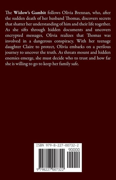 The Widow's Gambit follows Olivia Brennan, who, after the sudden death of her husband Thomas, discovers secrets that shatter her understanding of him and their life together. As she sifts through hidden documents and uncovers encrypted messages, Olivia realizes that Thomas was involved in a dangerous conspiracy. With her teenage daughter Claire to protect, Olivia embarks on a perilous journey to uncover the truth. As threats mount and hidden enemies emerge, she must decide who to trust and how far she is willing to go to keep her family safe.