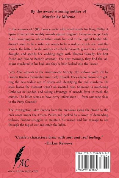 In the summer of 1588, Europe waits with bated breath for King Philip of Spain to launch his mighty armada against England. Everyone except Lady Alice Trumpington, whose father wants her wed to the highest bidder. She doesn't want to be a wife, she wants to be widow; a rich one, and the sooner, the better. So she marries an elderly viscount, gives him a sleeping draught, and spends her wedding night with Thomas Clarady, her best friend and Francis Bacon's assistant. The next morning, they find the viscount murdered in his bed and they're both locked into the Tower. Lady Alice appeals to the Andromache Society, the widows’ guild led by Francis Bacon's formidable aunt, Lady Russell. They charge Bacon with getting the new widow out of prison and identifying the real murderer. He soon learns the viscount wasn’t an isolated case. Someone is murdering Catholics in London and taking advantage of armada fever to mask the crimes. The killer seems to have privy information — from someone close to the Privy Council? The investigation takes Francis from the mansions along the Strand to the rack room under the Tower. Pulled and pecked by a coven of demanding widows, Francis struggles to maintain his reason and his courage to see through the fog of war and catch the killer.