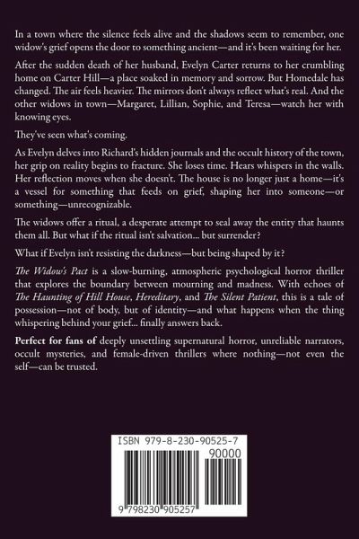 In a town where the silence feels alive and the shadows seem to remember, one widow's grief opens the door to something ancient-and it's been waiting for her. After the sudden death of her husband, Evelyn Carter returns to her crumbling home on Carter Hill-a place soaked in memory and sorrow. But Homedale has changed. The air feels heavier. The mirrors don't always reflect what's real. And the other widows in town-Margaret, Lillian, Sophie, and Teresa-watch her with knowing eyes. They've seen what's coming. As Evelyn delves into Richard's hidden journals and the occult history of the town, her grip on reality begins to fracture. She loses time. Hears whispers in the walls. Her reflection moves when she doesn't. The house is no longer just a home-it's a vessel for something that feeds on grief, shaping her into someone-or something-unrecognizable. The widows offer a ritual, a desperate attempt to seal away the entity that haunts them all. But what if the ritual isn't salvation... but surrender? What if Evelyn isn't resisting the darkness-but being shaped by it? The Widow's Pact is a slow-burning, atmospheric psychological horror thriller that explores the boundary between mourning and madness. With echoes of The Haunting of Hill House, Hereditary, and The Silent Patient, this is a tale of possession-not of body, but of identity-and what happens when the thing whispering behind your grief... finally answers back. Perfect for fans of deeply unsettling supernatural horror, unreliable narrators, occult mysteries, and female-driven thrillers where nothing-not even the self-can be trusted.