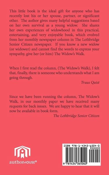 Most widows (and widowers) will experience a most traumatic period in the first year or two after they lose their spouse. The Widow's Walk: A survivor's handbook, gives helpful suggestions that will, (hopefully), ease some of the stress and strain for those who are newly widowed. Based on the author's own life experience, the book assures the reader that they are not losing their mind, they are only experiencing the normal patterns of grief. The book is an ideal gift for any new widow when you want to express your sympathy for the newly bereft, but cannot find the right words.