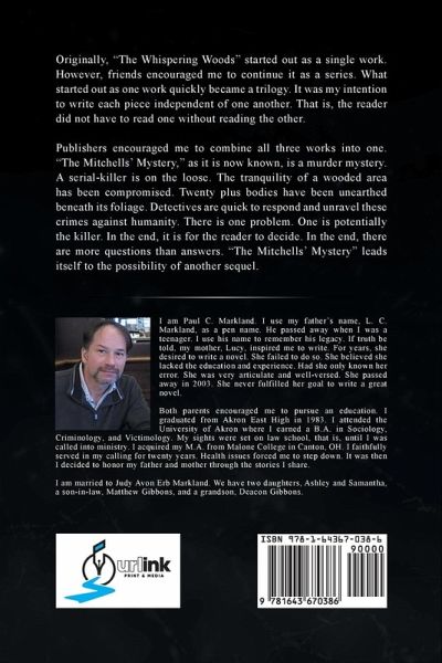 Originally, "The Whispering Woods" started out as a single work. However, friends encouraged me to continue it as a series. What started out as one work quickly became a trilogy. It was my intention to write each piece independent of one another. That is, the reader did not have to read one without reading the other. Publishers encouraged me to combine all three works into one. "The Mitchells' Mystery," as it is now known, is a murder mystery. A serial-killer is on the loose. The tranquility of a wooded area has been compromised. Twenty plus bodies have been unearthed beneath its foliage. Detectives are quick to respond and unravel these crimes against humanity. There is one problem. One is potentially the killer. In the end, it is for the reader to decide. In the end, there are more questions than answers. "The Mitchells' Mystery" leads itself to the possibility of another sequel.