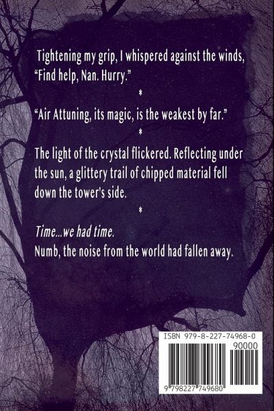 Tightening my grip, I whispered against the winds, "Find help, Nan. Hurry." * "Air Attuning, its magic, is the weakest by far." * The light of the crystal flickered. Reflecting under the sun, a glittery trail of chipped material fell down the tower's side. * Time...we had time. Numb, the noise from the world had fallen away. Time warps and mysteries deepen. Our heroes struggle to unite and face a terrible choice among revealing twists.