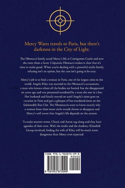 Mercy Watts travels to Paris, but there's darkness in the City of Light. The Fibonacci family saved Mercy's life at Cairngorms Castle and now she owes them a favor. Calpurnia Fibonacci makes it clear that it's time to make good. When you're dealing with a powerful mafia family, refusing isn't an option, but the case isn't going to be easy. Mercy's job is to find a woman in Paris, one of the largest cities in the world. Angela Riley was married to the Fibonacci's accountant, a man who knows where all the bodies are buried, but she disappeared six years ago and was presumed murdered by a man she met in a bar. Her husband and family moved on until Angela's sister goes on vacation in Paris and gets a glimpse of her murdered sister on the fashionable Rue Cler. The Fibonnaccis want to know exactly why a woman from their inner circle would choose to disappear and Mercy's well aware that Angela's life depends on the answer. To make matters worse, Chuck and Aaron tag along and they have agendas of their own. With the mafia and the shadowy Klinefeld Group involved, finding the wife of Riley will be much more dangerous than Mercy ever expected.
