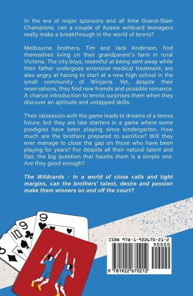 In the era of major sponsors and all time Grand-Slam Champions, can a couple of Aussie wildcard teenagers really make a breakthrough in the world of tennis? Melbourne brothers, Tim and Jack Anderson, find themselves living on their grandparent's farm in rural Victoria. The city boys, resentful at being sent away while their father undergoes extensive medical treatment, are also angry at having to start at a new high school in the small community of Winjarra. Yet, despite their reservations, they find new friends and possible romance. A chance introduction to tennis surprises them when they discover an aptitude and untapped skills. Their obsession with the game leads to dreams of a tennis future, but they are late starters in a game where some prodigies have been playing since kindergarten. How much are the brothers prepared to sacrifice? Will they ever manage to close the gap on those who have been playing for years? For despite all their natural talent and flair, the big question that haunts them is a simple one. Are they good enough? The Wildcards - In a world of close calls and tight margins, can the brothers' talent, desire and passion make them winners on and off the court?