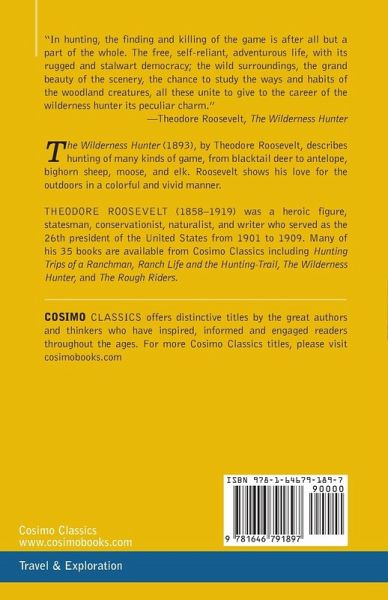 "In hunting, the finding and killing of the game is after all but a part of the whole. The free, self-reliant, adventurous life, with its rugged and stalwart democracy; the wild surroundings, the grand beauty of the scenery, the chance to study the ways and habits of the woodland creatures all these unite to give to the career of the wilderness hunter its peculiar charm." -Theodore Roosevelt, The Wilderness Hunter The Wilderness Hunter (1893), by Theodore Roosevelt, describes hunting of many kinds of game, from blacktail deer to antelope, bighorn sheep, moose, and elk. Roosevelt shows his love for the outdoors in a colorful and vivid manner.…mehr