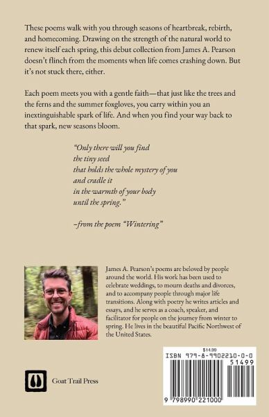 These poems walk with you through seasons of heartbreak, rebirth, and homecoming. Drawing on the strength of the natural world to renew itself each spring, this debut collection from James A. Pearson doesn't flinch from the moments when life comes crashing down. But it's not stuck there, either. Each poem meets you with a gentle faith-that just like the trees and the ferns and the summer foxgloves, you carry within you an inextinguishable spark of life. And when you find your way back to that spark, new seasons bloom. "Only there will you find the tiny seed that holds the whole mystery of you and cradle it in the warmth of your body until the spring." -from the poem "Wintering"