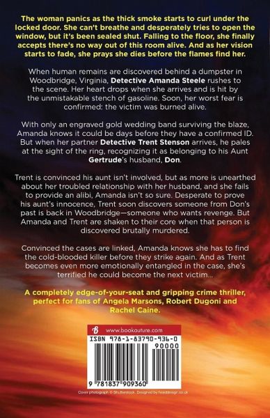 The woman panics as the thick smoke starts to curl under the locked door. She can't breathe and desperately tries to open the window, but it's been sealed shut. Falling to the floor, she finally accepts there's no way out of this room alive. And as her vision starts to fade, she prays she dies before the flames find her. When human remains are discovered behind a dumpster in Woodbridge, Virginia, Detective Amanda Steele rushes to the scene. Her heart drops when she arrives and is hit by the unmistakable stench of gasoline. Soon, her worst fear is confirmed: the victim was burned alive. With only an engraved gold wedding band surviving the blaze, Amanda knows it could be days before they have a confirmed ID. But when her partner Detective Trent Stenson arrives, he pales at the sight of the ring, recognizing it as belonging to his Aunt Gertrude's husband, Don. Trent is convinced his aunt isn't involved, but as more is unearthed about her troubled relationship with her husband, and she fails to provide an alibi, Amanda isn't so sure. Desperate to prove his aunt's innocence, Trent soon discovers someone from Don's past is back in Woodbridge-someone who wants revenge. But Amanda and Trent are shaken to their core when that person is discovered brutally murdered. Convinced the cases are linked, Amanda knows she has to find the cold-blooded killer before they strike again. And as Trent becomes even more emotionally entangled in the case, she's terrified he could become the next victim... A completely edge-of-your-seat and gripping crime thriller, perfect for fans of Angela Marsons, Robert Dugoni and Rachel Caine.