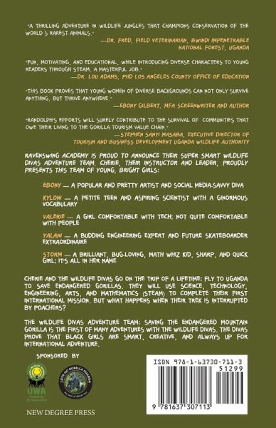 Ravenswing Academy is proud to announce their super smart Wildlife Divas Adventure Team. Cherie, their instructor and leader, proudly presents this team of young, bright girls: EBONY - A popular and pretty artist and social media-savvy diva KYLONI - A petite teen and aspiring scientist with a ginormous vocabulary VALERIE - A girl comfortable with tech; not quite comfortable with people YALANI - A budding engineering expert and future skateboarder extraordinaire STORM - A brilliant, bug-loving, math whiz kid, sharp, and quick girl; it's all in her name Cherie and the Wildlife Divas go on the trip of a lifetime: fly to Uganda to save endangered gorillas. They will use science, technology, engineering, arts, and mathematics (STEAM) to complete their first international mission. But what happens when their trek is interrupted by poachers? THE WILDLIFE DIVAS ADVENTURE TEAM: Saving the Endangered Mountain Gorilla is the first of many adventures with the Wildlife Divas. The Divas prove that Black girls are smart, creative, and always up for international adventure