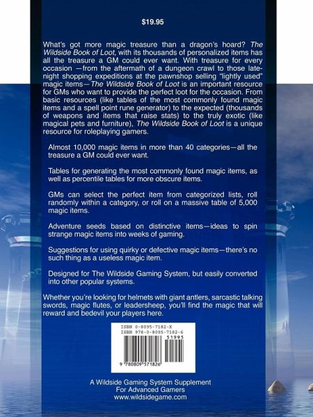 * What's got more magic treasure than a dragon's hoard? The Wildside Book of Loot, with its thousands of personalized items has all the treasure a GM could ever want. With treasure for every occasion -- from the aftermath of a dungeon crawl to those late-night shopping expeditions at the pawnshop selling "lightly used" magic items -- The Wildside Book of Loot is an important resource for GMs who want to provide the perfect loot for the occasion. From basic resources (like tables of the most commonly found magic items and a spell point rune generator) to the expected (thousands of weapons and items that raise stats) to the truly exotic (like magical pets and furniture), The Wildside Book of Loot is a unique resource for roleplaying gamers.