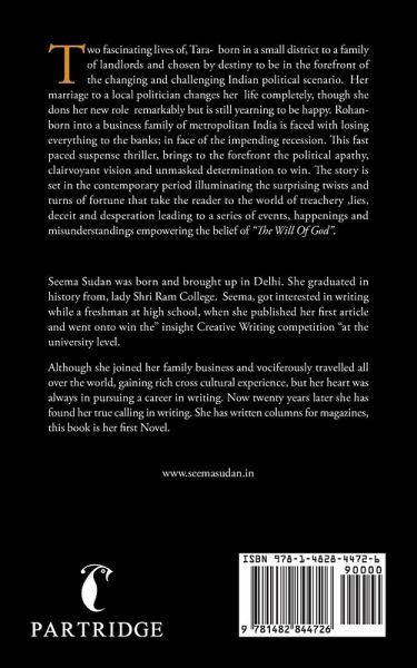 Two fascinating lives of, Tara- born in a small district to a family of landlords and chosen by destiny to be in the forefront of the changing and challenging Indian political scenario. Her marriage to a local politician changes her life completely, though she dons her new role remarkably but is still yearning to be happy. Rohan-born into a business family of metropolitan India is faced with losing everything to the banks; in face of the impending recession. This fast paced suspense thriller, brings to the forefront the political apathy, clairvoyant vision and unmasked determination to win. The story is set in the contemporary period illuminating the surprising twists and turns of fortune that take the reader to the world of treachery ,lies, deceit and desperation leading to a series of events, happenings and misunderstandings empowering the belief of "The Will Of God".