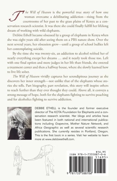 The Will of Heaven is the powerful true story of how one woman overcame a debilitating addiction−rising from the courtrooms of her past to the grass plains of Kenya as a conservation research scientist. It was there she could finally fulfill her lifelong dream of working with wild elephants. Debbie Ethell became obsessed by a group of elephants in Kenya when she was eight years old after seeing them on a PBS nature show. Over the next several years, her obsession grew−until a group of school bullies left her contemplating suicide. By the time she was twenty-six, an addiction to alcohol robbed her of nearly everything except her dreams … and it nearly took those too. Left with one final option and more judges in her life than friends, she entered a treatment center and then a halfway house, where she slowly learned how to live life sober. The Will of Heaven vividly captures her serendipitous journey as she discovers her inner strength−not unlike that of the elephants whose stories she tells. Part biography, part revelation, this story will inspire others to reach further than they ever thought they could. Above all, it conveys a strong message of hope, both for elephants fighting to survive poaching and for alcoholics fighting to survive addiction.