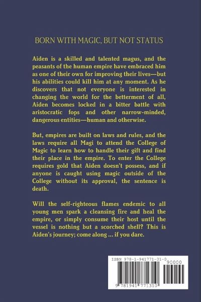 Born with magic, but not status. Aiden is a skilled and talented magus, and the peasants of the human empire have embraced him as one of their own for improving their lives - but his abilities could kill him at any moment. As he discovers that not everyone is interested in changing the world for the betterment of all, Aiden becomes locked in a bitter battle with aristocratic fops and other narrow-minded, dangerous entities - human and otherwise. But empires are built on laws and rules, and the laws require all Magi to attend the College of Magic to learn how to handle their gift and find their place in the empire. To enter the College requires gold that Aiden doesn't possess, and if anyone is caught using magic outside of the College without its approval, the sentence is death. Will the self-righteous flames endemic to all young men spark a cleansing fire and heal the empire, or simply consume their host until the vessel is nothing but a scorched shell? This is Aiden's journey; come along...if you dare.