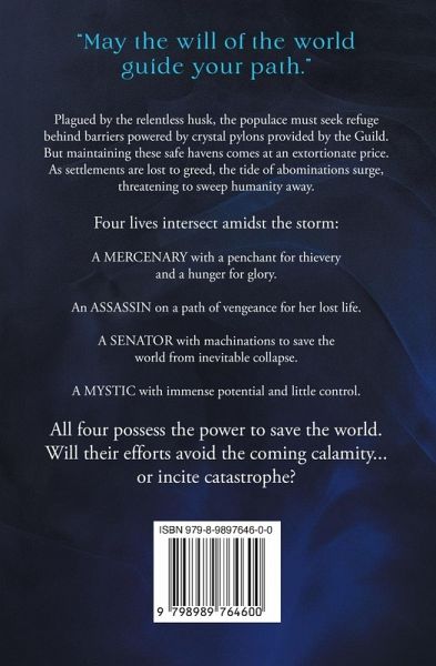 "MAY THE WILL OF THE WORLD GUIDE YOUR PATH" Plagued by the relentless husk, the populace must seek refuge behind barriers powered by crystal pylons provided by the Guild. But maintaining these safe havens comes at an extortionate price. As settlements are lost to greed, the tide of abominations surge, threatening to sweep humanity away. Four lives intersect amidst the storm: A mercenary with a penchant for thievery and a hunger for glory. An assassin on a path of vengeance for her lost life. A senator with machinations to save the world from inevitable collapse. A mystic with immense potential and little control. All four possess the power to save the world. Will their efforts avoid the coming calamity or incite catastrophe?