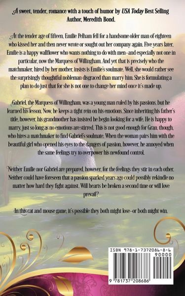 A sweet, tender, romance with a touch of humor by USA Today Best Selling Author, Meredith Bond. At the tender age of fifteen, Emilie Pelham fell for a handsome older man of eighteen who kissed her and then never wrote or sought out her company again. Five years later, Emilie is a happy wallflower who wants nothing to do with men-and especially not one in particular, now the Marquess of Willingham. And yet that is precisely who the matchmaker, hired by her mother, insists is Emilie's soulmate. Well, she would rather see the surprisingly thoughtful nobleman disgraced than marry him. She is formulating a plan to do just that for she is not one to change to her mind once it's made up. Gabriel, the Marquess of Willingham, was a young man ruled by his passions, but he learned his lesson. Now, he keeps a tight rein on his emotions. Since inheriting his father's title, however, his grandmother has insisted he begin looking for a wife. He is happy to marry, just so long as no emotions are stirred. This is not good enough for Gran, though, who hires a matchmaker to find Gabriel's soulmate. When the woman pairs him with the beautiful girl who opened his eyes to the dangers of passion, however, he annoyed when the same feelings try to overpower his newfound control. Neither Emilie nor Gabriel are prepared, however, for the feelings they stir in each other. Neither could have foreseen that a passion sparked years ago could possibly rekindle no matter how hard they fight against. Will hearts be broken a second time or will love prevail? In this cat and mouse game, it's possible they both might lose-or both might win.
