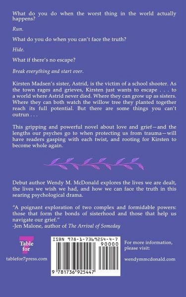 CW: gun violence, death, and post-traumatic stress symptoms. ¿What do you do when the worst thing in the world actually happens? Run. What do you do when you can't face the truth? Hide. What if there's no escape? Break everything and start over. Kirsten Madsen's sister, Astrid, is the victim of a school shooter. As the town rages and grieves, Kirsten just wants to escape... to a world where Astrid never died. Where they can grow up as sisters. Where they can both watch the willow tree they planted together reach its full potential. But there are some things you can't outrun... This gripping and powerful novel about love and grief-and the lengths our psyches go to when protecting us from trauma-will have readers gasping with each twist, and rooting for Kirsten to become whole again. Debut author Wendy M. McDonald explores the lives we are dealt, the lives we wish we had, and how we can face the truth in this searing psychological drama.