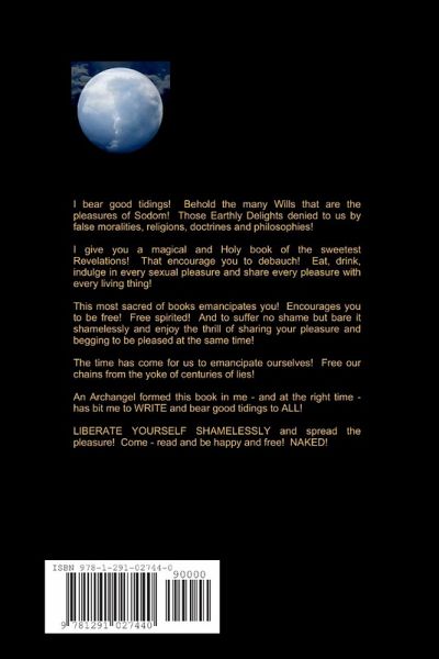 I bear good tidings! Behold the many Wills that are the pleasures of Sodom! Those Earthly Delights denied to us by false moralities, religions, doctrines and philosophies! I give you a magical and Holy book of the sweetest Revelations! That encourage you to debauch! Eat, drink, indulge in every sexual pleasure and share every pleasure with every living thing! This most sacred of books emancipates you! Encourages you to be free! Free spirited! And to suffer no shame but bare it shamelessly and enjoy the thrill of sharing your pleasure and begging to be pleased at the same time! The time has come for us to emancipate ourselves! Free our chains from the yoke of centuries of lies! An Archangel formed this book in me - and at the right time - has bit me to WRITE and bear good tidings to ALL! LIBERATE YOURSELF SHAMELESSLY and spread the pleasure! Come - read and be happy and free! NAKED!