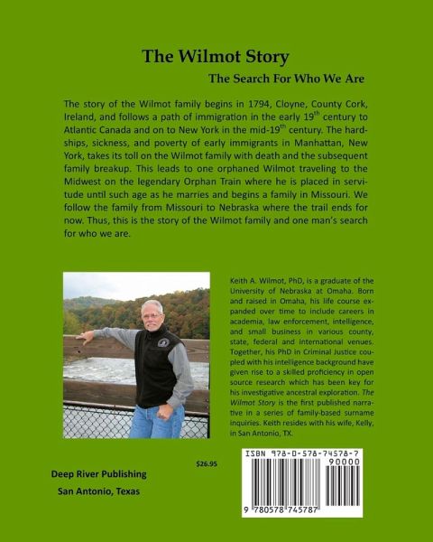 The story of the Wilmot family begins in 1794, Cloyne, County Cork, Ireland, and follows a path of immigration in the early 19th century to Atlantic Canada and on to New York in the mid-19th century. The hardships, sickness, and poverty of early immigrants in Manhattan, New York, takes its toll on the Wilmot family with death and the subsequent family breakup. This leads to one orphaned Wilmot traveling to the Midwest on the legendary Orphan Train where he is placed in servitude until such age as he marries and begins a family in Missouri. We follow the family from Missouri to Nebraska where the trail ends for now. Thus, this is the story of the Wilmot family and one man's search for who we are.