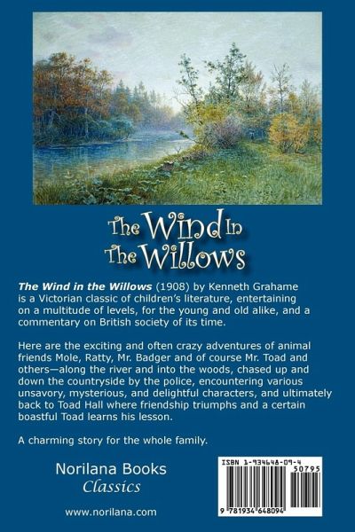 The Wind in the Willows (1908) by Kenneth Grahame is a Victorian classic of children's literature, entertaining on a multitude of levels, for the young and old alike, and a commentary on British society of its time. Here are the exciting and often crazy adventures of animal friends Mole, Ratty, Mr. Badger and of course Mr. Toad and others -- along the river and into the woods, chased up and down the countryside by the police, encountering various unsavory, mysterious, and delightful characters, and ultimately back to Toad Hall where friendship triumphs and a certain boastful Toad learns his lesson. A charming story for the whole family.