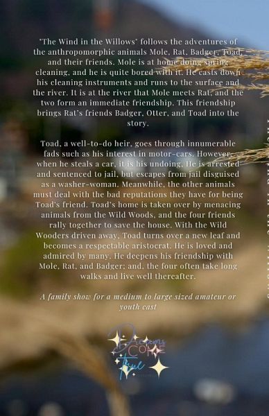 "The Wind in the Willows" follows the adventures of the anthropomorphic animals Mole, Rat, Badger, Toad, and their friends. Mole is at home doing spring cleaning, and he is quite bored with it. He casts down his cleaning instruments and runs to the surface and the river. It is at the river that Mole meets Rat, and the two form an immediate friendship. This friendship brings Rat's friends Badger, Otter, and Toad into the story. Toad, a well-to-do heir, goes through innumerable fads such as his interest in motor-cars. However, when he steals a car, it is his undoing, He is arrested and sentenced to jail, but escapes from jail disguised as a washer-woman. Meanwhile, the other animals must deal with the bad reputations they have for being Toad's friend. Toad's home is taken over by menacing animals from the Wild Woods, and the four friends rally together to save the house. With the Wild Wooders driven away, Toad turns over a new leaf and becomes a respectable aristocrat. He is loved and admired by many. He deepens his friendship with Mole, Rat, and Badger; and, the four often take long walks and live well thereafter. A family show for a medium to large sized amateur or youth cast