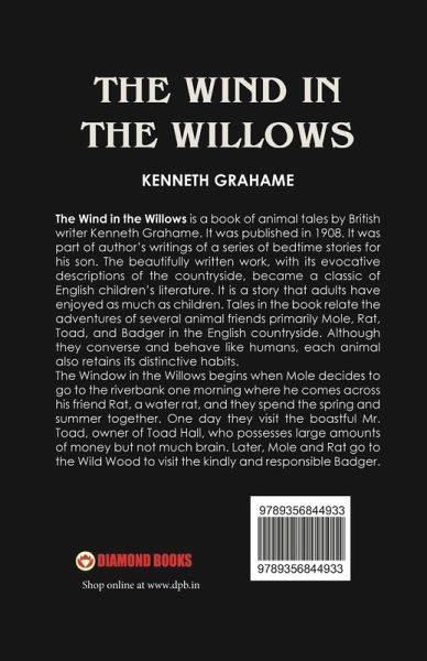 The Wind in the Willows is a book of animal tales by British writer Kenneth Grahame. It was published in 1908. It was part of author?s writings of a series of bedtime stories for his son. The beautifully written work, with its evocative descriptions of the countryside, became a classic of English children?s literature. It is a story that adults have enjoyed as much as children. Tales in the book relate the adventures of several animal friends primarily Mole, Rat, Toad, and Badger in the English countryside. Although they converse and behave like humans, each animal also retains its distinctive habits. The Window in the Willows begins when Mole decides to go to the riverbank one morning where he comes across his friend Rat, a water rat, and they spend the spring and summer together. One day they visit the boastful Mr. Toad, owner of Toad Hall, who possesses large amounts of money but not much brain. Later, Mole and Rat go to the Wild Wood to visit the kindly and responsible Badger.