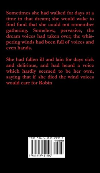 Sometimes she had walked for days at a time in that dream; she would wake to find food that she could not remember gathering. Somehow, pervasive, the dream voices had taken over; the whispering winds had been full of voices and even hands. She had fallen ill and lain for days sick and delirious, and had heard a voice which hardly seemed to be her own, saying that if she died the wind voices would care for Robin.
