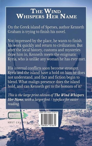 On the Greek island of Spetses, author Kenneth Graham is trying to finish his novel. Not impressed by the place, he wants to finish his work quickly and return to civilization. But after the local history, customs and mysteries draw him in, Kenneth meets the enigmatic Kyria, who is unlike any woman he has ever met. His internal conflicts soon become stronger. Kyria and the island have a hold on him he does not understand, and fact and fiction begin to blend. What malign presence does the island hold, and can Kenneth get to the bottom of it? This is the large print edition of The Wind Whispers Her Name, with a larger font / typeface for easier reading.